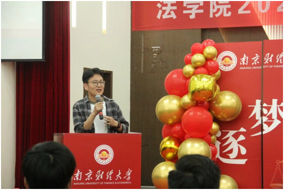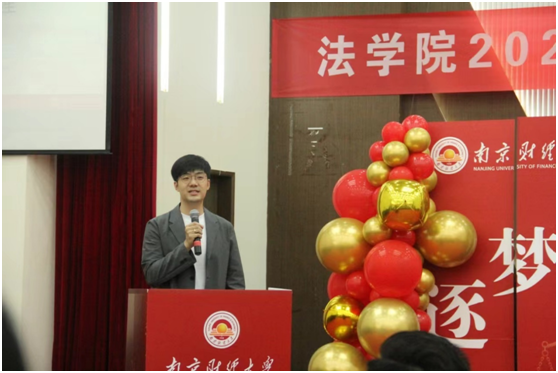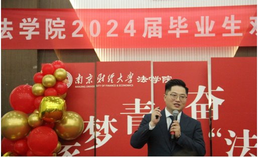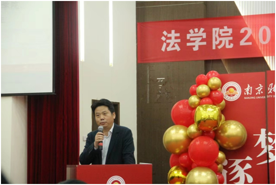 优秀员工代表,北京观韬中茂(南京)律师事务所管理合伙人、南京市律师协会副秘书长王政律师也在典礼上发言。他表达了对母校的感激之情和对未来的美好憧憬,回顾了在校期间的点点滴滴,分享了自己的成长经历和感悟。同时,他以“内卷”和“躺平”两个关键词给同学们上了一堂职业生涯规划课。他说真正的内卷并不可怕,作为时代新人,同学们应当做到的是正视内卷,拒绝躺平。要充分发挥能动性,积极拓展外部资源,避免低水平重复的内卷。同时,要勇于创新,积极发掘内部潜力,习惯在环境的约束下挖掘潜能。