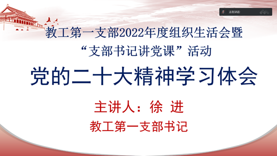 支部书记徐进首先主讲党课,汇报了学习党的二十大精神的心得体会。他认为,党的二十大是在全党全国各族人民迈上全面建设社会主义现代化国家新征程、向第二个百年奋斗目标进军的关键时刻召开的一次十分重要的大会。党的十八大以来的伟大变革,在党史、新中国史、中华民族发展史上具有里程碑的意义。党的二十届一中全会选举习近平同志继续担任党的总书记,体现了全党、全军、全国各族人民的共同愿望。作为普通党员,我们要全面贯彻习近平新时代中国特色社会主义思想,弘扬伟大建党精神,自信自强、守正创新,踔厉奋发、勇毅前行,为全面建设社会主义现代化国家、全面推进中华民族伟大复兴而团结奋斗。支部书记徐进的汇报结束后,各位党员同志也在线上汇报了自己的学习心得。