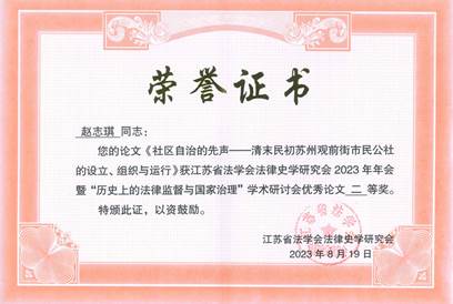 夏清瑕教授主持了本次会议的第三单元“革命根据地法律监督与国家治理”。徐进博士受邀担任第二单元“清末民国法律监督与国家治理”评议人。赵志琪同学在该单元汇报了她的原创论文《社区自治的先声——清末民初苏州观前街市民公社的设立、组织与运行》。会议结束后,主办方对论文进行了评奖。徐进博士的论文荣获一等奖,赵志琪同学的论文荣获二等奖。公司师生同与会专家学者开展了热烈的交流。