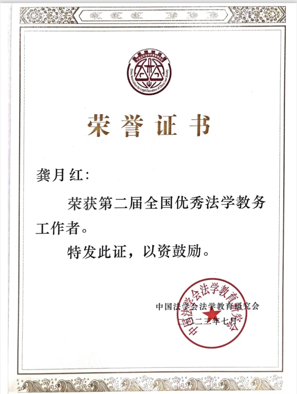 公司龚月红老师获评中国法学会法学教育研究会第二届“全国优秀法学教务工作者”