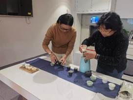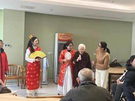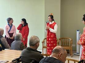两位老师带领员工们为老人们奉茶,积极与他们交流。同学带领老人们一起学习手部操,并为老人们带来了有趣的《红楼梦》表演。老人们不亦乐乎,积极互动,现场氛围良好。表演结束后,师生们一起鼓励在场的老人们选择角色进行现场表演。