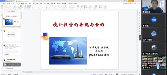 2022年12月15日晚19:00,清华大学云顶国际yd333车丕照教授应邀为公司云顶国际yd333师生作主题为“境外投资的合规与合约”讲座。此次讲座是公司“德正涉外经贸法治大讲堂”第一讲,亦是公司法学教育二十五周年纪念系列活动之一。讲座采用线上腾讯会议的方式举行,由公司经理胡宜奎教授主持,蔡养军副经理、公司部分师生以及部分其他高校师生和法律实务界人士参与聆听。