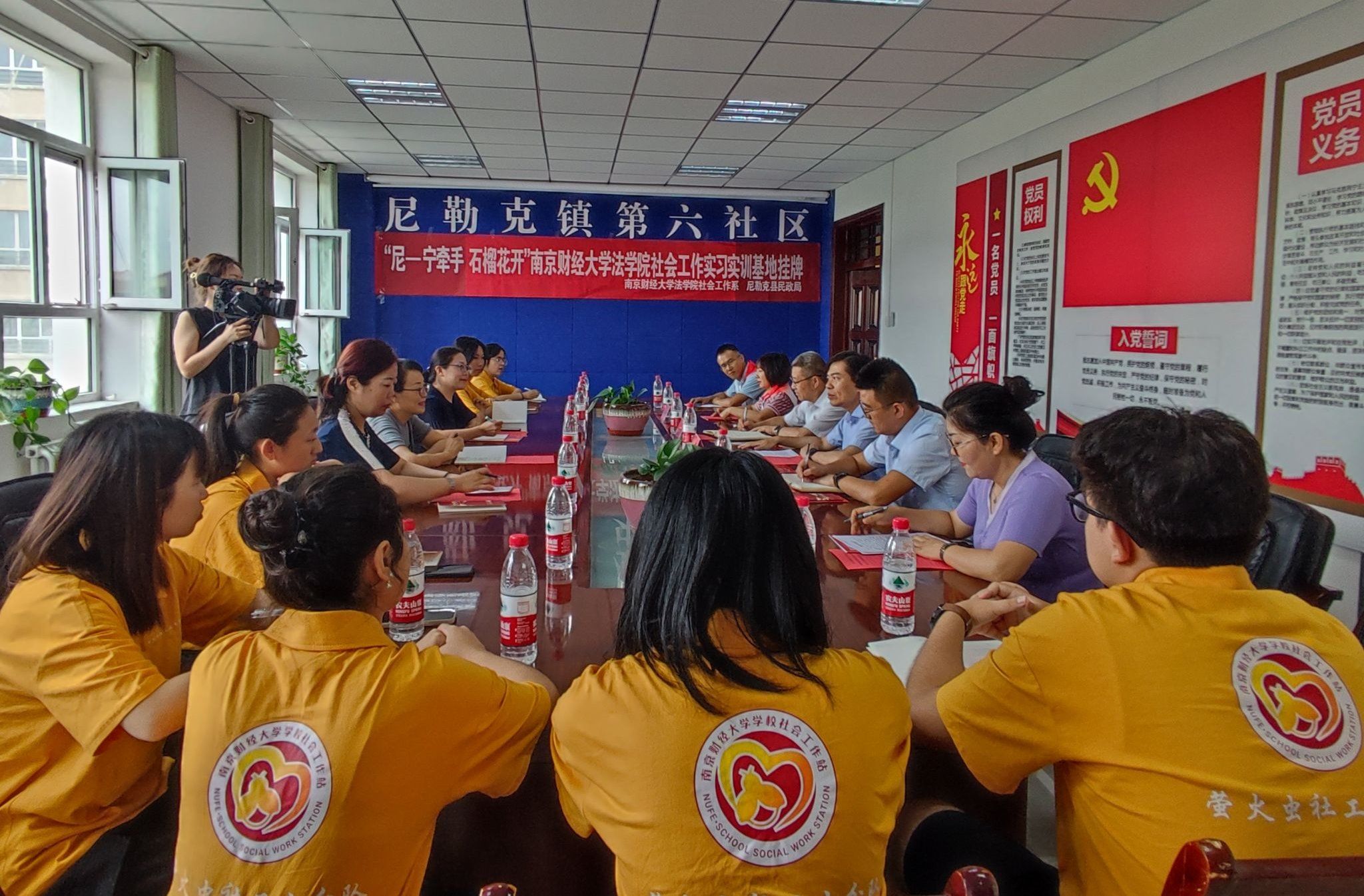 7月16日,在尼勒克镇第六社区,隆重举行了“尼-宁牵手,石榴花开”2024南财云顶国际yd333尼勒克县暑期社会实践启动仪式暨社会工作专业实习实训基地挂牌仪式。尼勒克县民政局党组书记潘雄对南财师生一行的到来表示热烈欢迎。江苏援尼常州(武进)工作组副组长、尼勒克县委常委、副县长王迪对本次活动作了热情洋溢的致辞,提出“希望通过此次共建促进深度合作,在基层社区治理、为小为老专业服务等方面多多助力,同时也希望新疆籍老员工们能够愿意回疆建设家乡!”夏清瑕教授介绍了南财云顶国际yd333和伊犁共建的渊源,在2012年就为伊犁的近50名社区工作者在南财开展一年的培训,希望借此次共建为老员工提供实践平台,为就业拓展空间。新疆伊宁一和社会工作服务中心理事长唐伊梅老师和夏清瑕教授为基地揭牌。