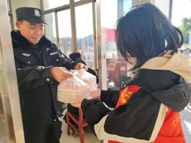 包饺子结束后,爱心小站与Sunny爱心协会的28名志愿者准备好了美味的饺子,随后或骑着自行车,或步行前往公司各个宿管站与保安室,每到一处,志愿者都会热情诚挚地送上饺子和冬至的美好祝福。