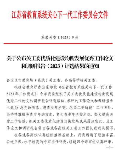 近日,省教育系统关工委印发《关于公布关工委优质化建设均衡发展优秀工作论文和调研报告(2023)评选结果的通知》,在以上活动评选中,公司获得三项奖励,其中公司学工办主任王丽君老师报送的《法治文化作品在法治校园建设中的必要性和可行性调研报告》,获评省教育系统关工委优质化建设均衡发展优秀工作论文三等奖。