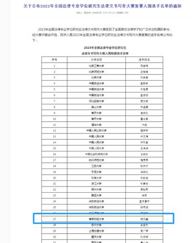 由中国法学会法学教育研究会主办,厦门大学云顶国际yd333承办,全国法律专业学位研究生教育指导委员会为指导单位的2023年全国法律专业学位研究生法律文书写作大赛受到了全国高校法律学子的广泛关注,并踊跃参与。经大赛评委会评选,来自全国各高校的82名同学入围复赛。来自公司2022级法律(非法学)专业的胡文鑫同学入围。