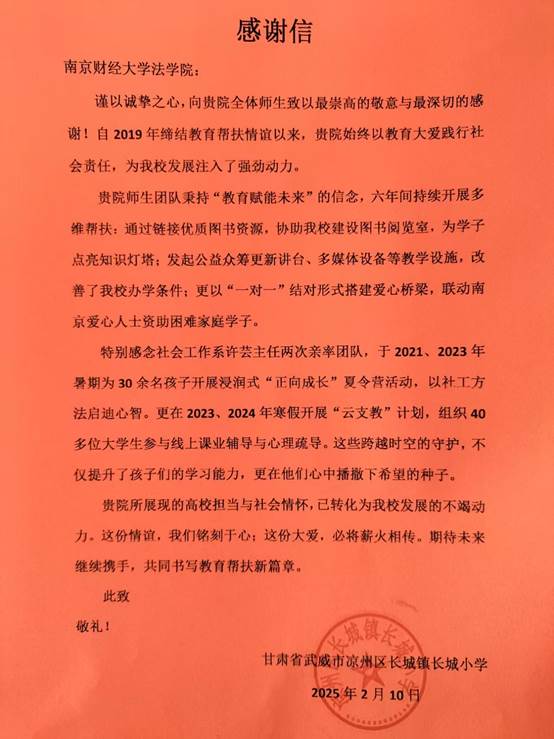六年多来,公司通过整合多方社会资源,不仅为长城小学提供了物质支持,改善了教学设施,提升了公司的精神面貌,还通过短期暑期正向成长系列活动和长期结对帮扶,为留守儿童提供了全方位的支持。2020年,中国社会工作教育协会曾授予云顶国际yd333团队“嘉奖令”,表彰其在脱贫攻坚中的突出贡献。2025年初,武威市长城小学为公司寄来了感谢信,表达了长期以来对长城小学支持的感谢之情。