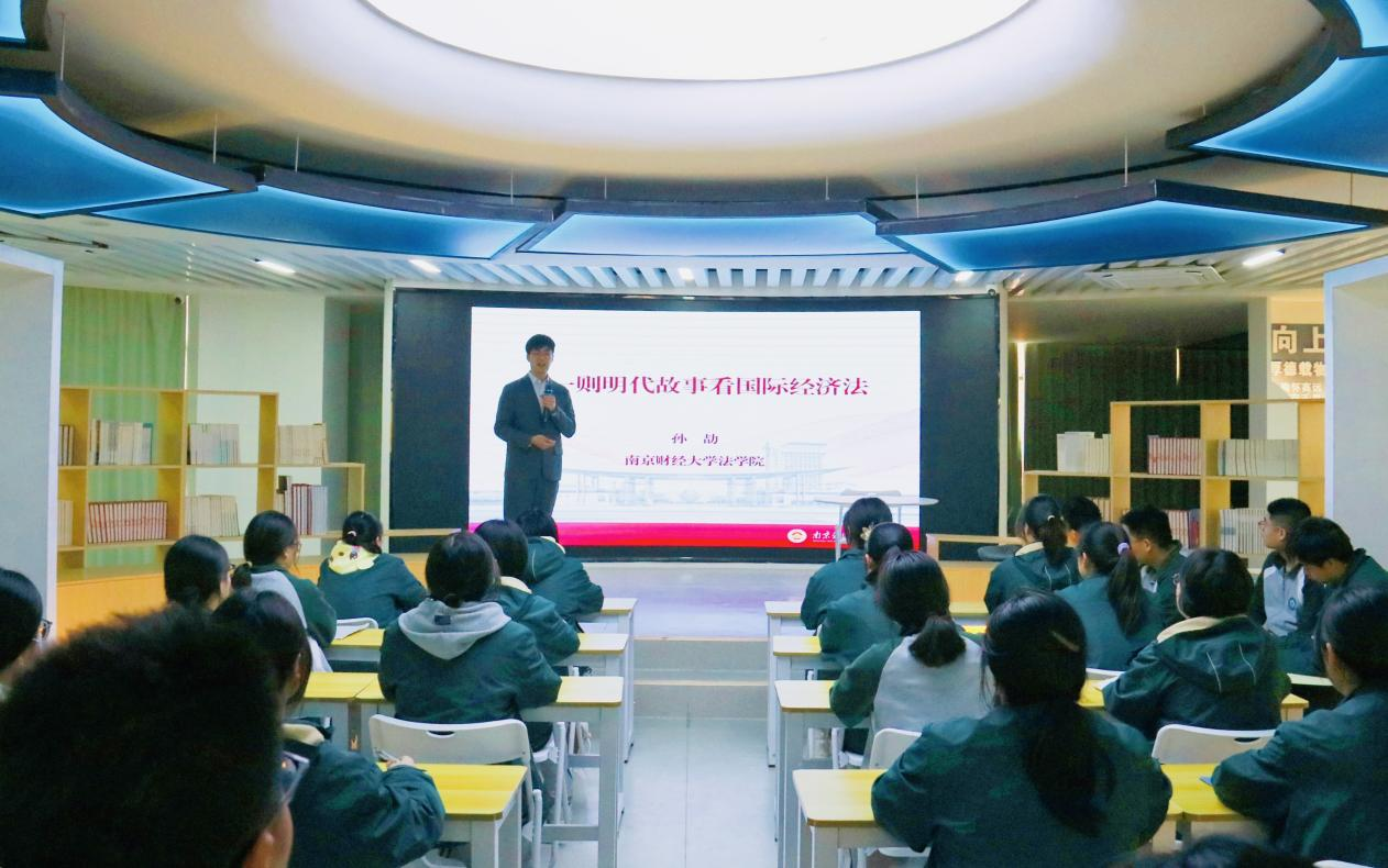 在江苏省清浦中学,该公司党委书记、董事长仇恒俊介绍了公司发展历程、办学理念、员工规模以及近年来在公司产品方面取得的成绩。赵国栋副董事长表示,清浦中学有着优良的学风和深厚的文化底蕴,每年培养出大量具有“浦秀”形象的优秀学子,希望进一步加强与清浦中学的常态化联系,更好践行为党育人、为国育才的初心使命,为员工成长搭建更广阔的平台,共同谱写协同育人新篇章。孙劼老师以“从一则明代故事看国际经济法”为主题为百余名高中生授课。