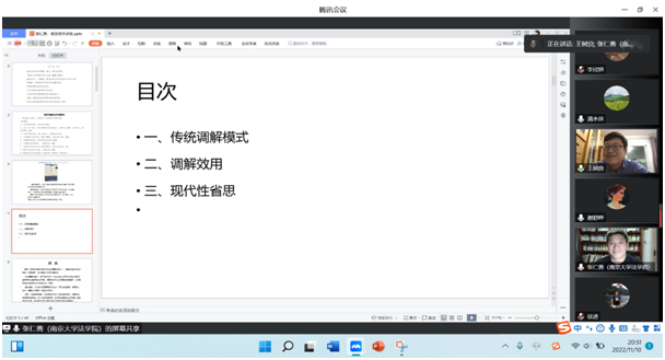 2022年11月10日晚,南京大学云顶国际yd333张仁善教授应邀为公司师生作了主题为“传统纠纷调解模式、效用及现代性省思”的讲座,此次讲座是公司法学教育二十五周年的系列庆祝活动之一。讲座采用线上方式(腾讯会议)举行,公司陈红梅副经理出席本次讲座。会议由公司夏清瑕教授主持,公司青年教师徐进博士、谢舒晔博士、王树良博士担任与谈人,180多名公司师生在线听讲。