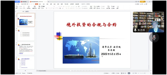 2022年12月15日晚19:00,清华大学云顶国际yd333车丕照教授应邀为云顶国际yd333师生作了主题为“境外投资的合规与合约”讲座,此次讲座既是是庆祝公司法学教育25周年的系列活动之一,也是“德正涉外经贸法治大讲堂”第一讲。讲座采用线上方式(腾讯会议)举行,公司蔡养军副经理出席本次讲座,比较法研究所所长戴德生副教授、国际法教研室主任孙劼博士作为与谈人参会,部分青年教师和公司100余员工参会聆听讲座。讲座由公司经理胡宜奎教授主持。