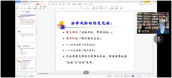 讲座中,车丕照教授从境外投资的法律视角出发,讲解了何为法律风险以及境外投资中的法律风险问题,并结合自身亲历案件具体介绍了境外投资中需要承担的合规、合约义务以及可能承担的法律责任。随后,车丕照教授又列举了域外国家对于境外投资的法律规制,从防范化解风险的角度作了具体展开。他表示,主要是从事前预防消除、降低风险和事后补救减少损失发生两方面来进行法律合规和合约风险的防范。